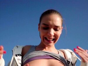 Bebé fitness muestra sus tetas en público. La morena henessy muestra sus tetas calientes en público por dinero y luego folla a un extraño con una verga enorme y se la chupa en un lugar público tranquilo